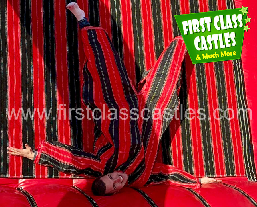 The aim of the game is to go head to head against your opponent in this vertical climbing challenge of bravery and determination. The winner is the person who can bounce and stick the highest point of the velcro wall... If they can make it at all that is. The challenge seems harmless at first but soon becomes a real challenge of skill, whit, speed, timing and determination. Its fantastically competitive and will leave guests queuing for more time and time again.
