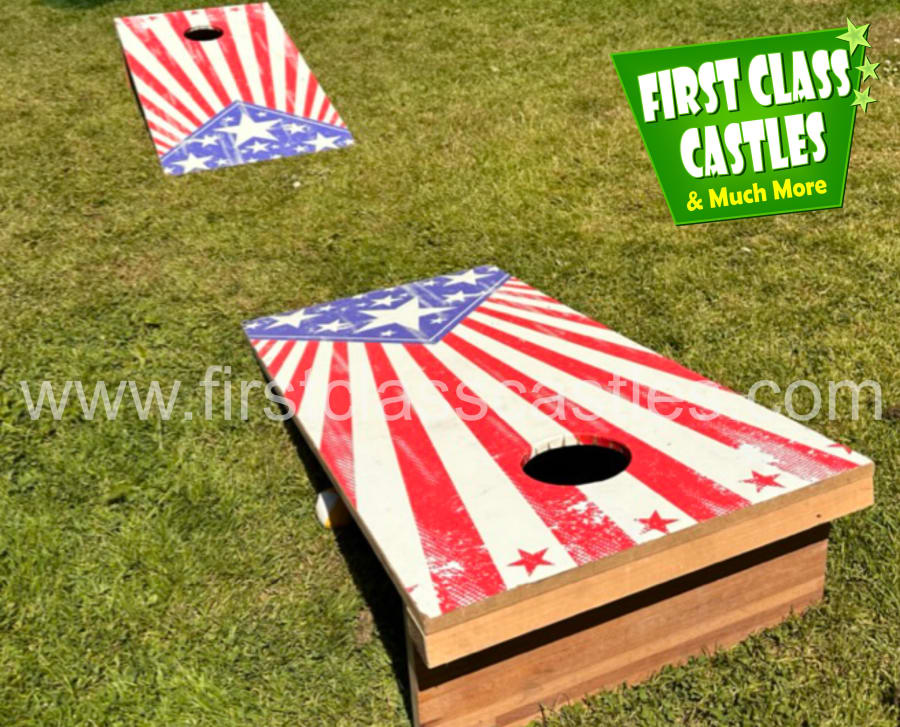 Introducing our fully themed premium Cornhole Toss Game for Hire. We've taken the hugely popular American tail gating game and fully themed the facade using printed aluminium panels. The art-work branding compliments our other Carnival Stalls & Carnival Games hire products. For those competitive players, rest assured the game is manufactured to Cornhole Toss regulation standard (yes, there's actually regulations, it's a serious sport). Our Cornhole Game hire or bean bag toss as its also called is an ideal indoor or outdoor game. It is challenging enough for older, experienced players, yet still easy enough for kids to jump in and play. This game comes complete with Cornhole bean bags. You get two sets, so each team has four regulation-sized bean bags. You may notice the game boards are creatively designed to have a red side and a blue side,