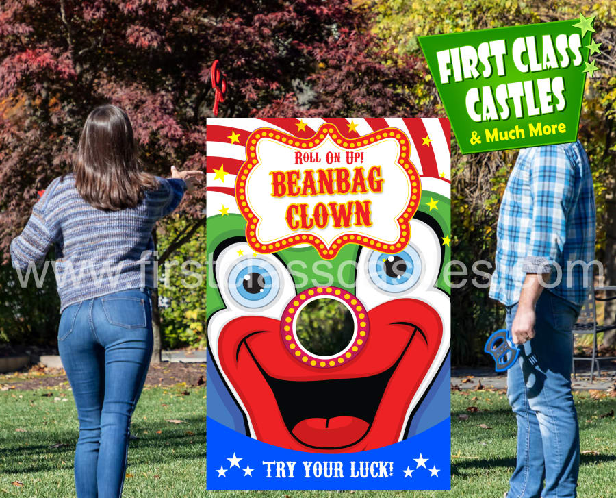Step right up! All the fun of the fair.... Introducing our fully themed premium Beanbag Clown Carnival Game for Hire. Designed especially for us at EventBase, this games is designed to land a bean bag in the Clowns mouth to WIN! The art-work branding compliments our other Carnival Stalls & Carnival Games hire products. Our Beanbag Clown Game hire or bean bag is an ideal indoor or outdoor game. It is challenging enough for older, experienced players, yet still easy enough for kids to jump in and play. This game comes complete with throwing bean bags. Hire this incredible side show attraction for your next Carnival, Circus or Fairground Themed Event.