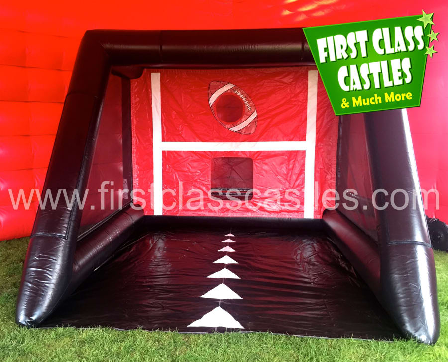 Description: 12ft(L) x 12ft(W) x 10ft(H) 2in1 Inflatable Rugby Toss / Football Shootout Arena. Test your football or rugby skills with our cool ‘Penalty Shootout'. Designed for all you budding Torres, Ronaldo & Peles – our Rugby / Football Shootout will get you into professional shape in no time. There are 4 different size holes to aim for, and we’ll give you a football to play with.Invite some friends round to your back garden, and challenge them for a shootout match. Or perhaps it’s your town fair or compant party where the entire village / company can get a real competition on? Once successfully shot through, the footballs land in a zipped net behind which you can easily access - so you can play over and over again! This game can be set as a rugby toss or football shootout game, with the versatile changeable panel. This item also has velcro panels for branding opportunities.