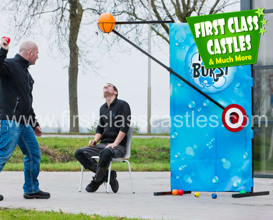 Description: Our Dunk Tank is a great product but can be problematic to fill and drain... for a more straightforward solution, we've developed Aqua Drop. Aqua Drop is just like a dunk tank that works in reverse and is a much simpler product to use and can virtually be used anywhere and only 15mins set-up time. It is a perfect game for any outdoor carnival or event you might have and is rented out frequently to schools for different events.. It can even be used indoors by placing a paddling pool around the chair or even filling the balloon with confetti instead of water. Aqua Drop is the opposite of a dunk tank as it dumps water on the person, rather than the person into the water. Aqua Drop (sometimes called Pitch Burst ) has a basket that holds a balloon full of water (or confetti!) and explodes once the button is hit with a ball.