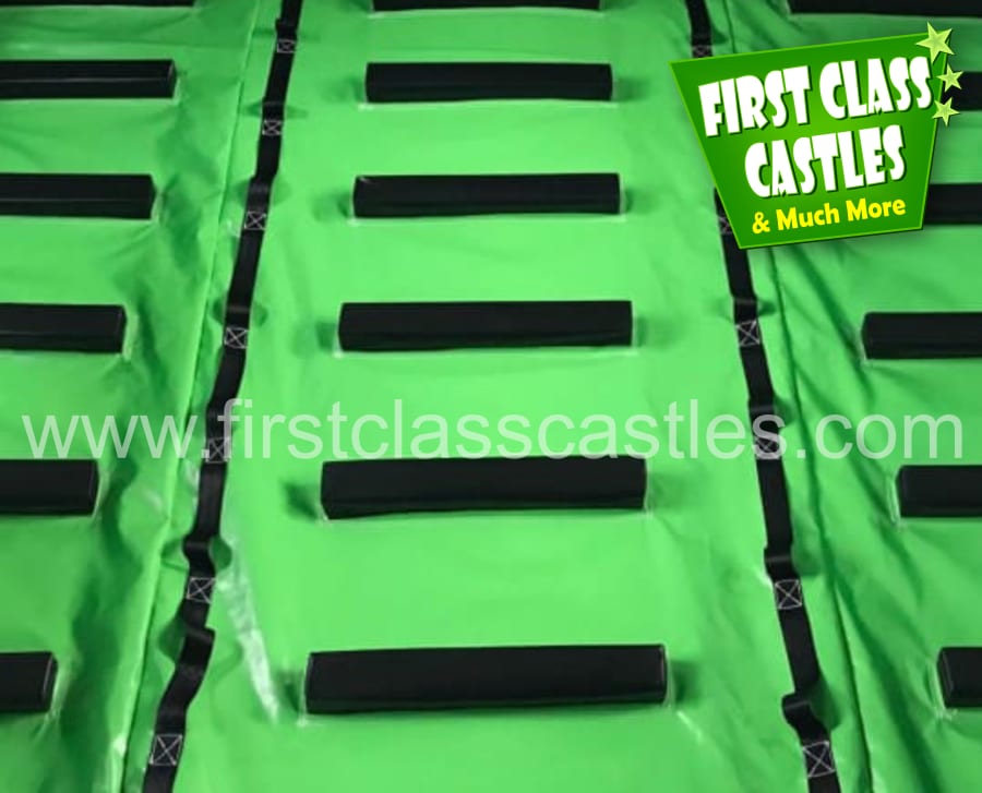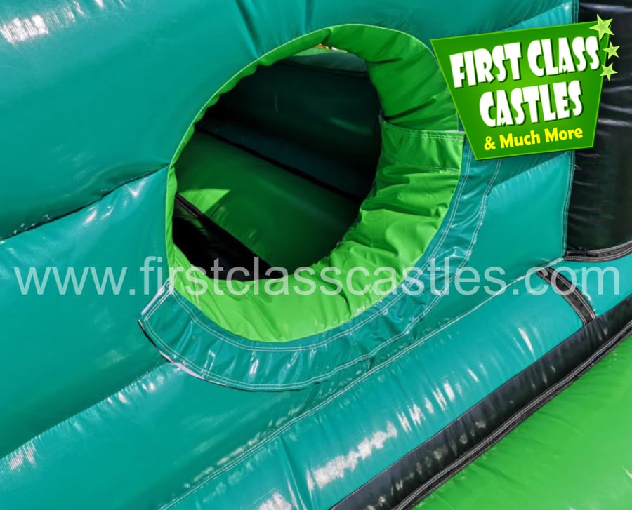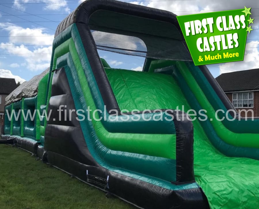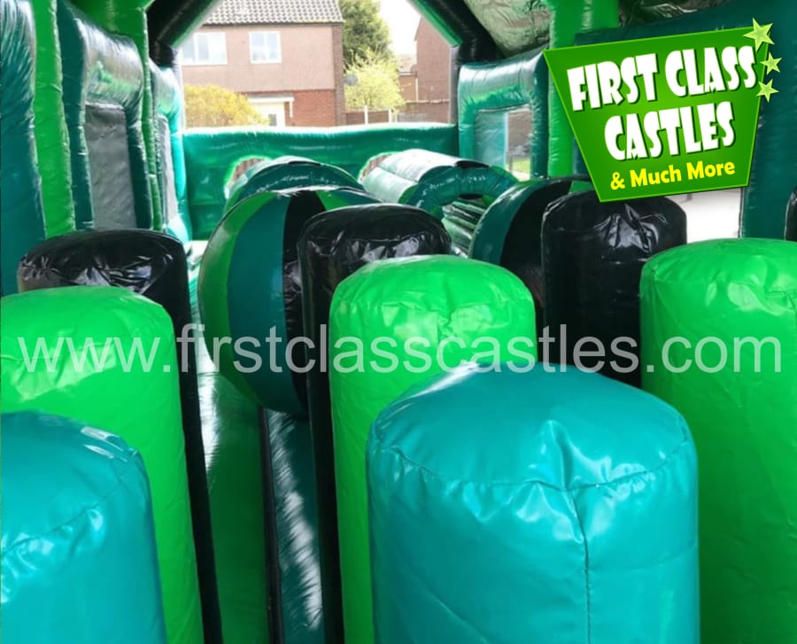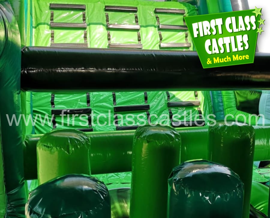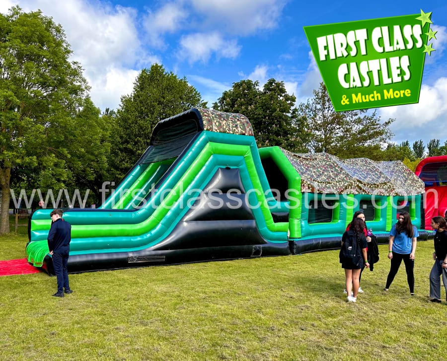Description: Measuring 65ft(L) x 15ft(W) x 18ft(H) "Military Mission" is a huge twin lane Army themed Obstacle Course with integrated 10ft platform drop slide. This Obstacle Course for hire is MEGA! Suitable for any age group, both Adults & Kids events alike (just not at the same time of course!) Consists of climbing, crawling and sliding areas. Really impressive and large scale unit for any event. This is a monster. The cool green army combat theme looks impressive on any landscape or event site with fully camouflage printed roof. This product is also available in an Olympic Games theme called "Olympic Quest". This item is exclusively designed and built for First Class Castles. Click on the 'more info' button to view additional images. This assault course inflatable is fantastic as part of a team building activity, it's a Knockout or Military Assault Challenge Course. Contact our team for further information on Family Fun Day events and Corporate Entertainment + Team Building Activities.