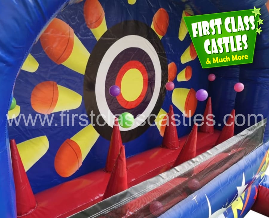 Players take it in turn to man the gun stations, 2 at a time and shoot away at the targets in front of them in a set amount of time. The inflatable tin can alley is wild west themed to make it that little bit extra special and is an Ideal carnival game, team building game, fundraiser and event showstopper and works really well when played as part of a time challenge with potential prizes for those able to knock the most balls out of the air in the allotted timescale.