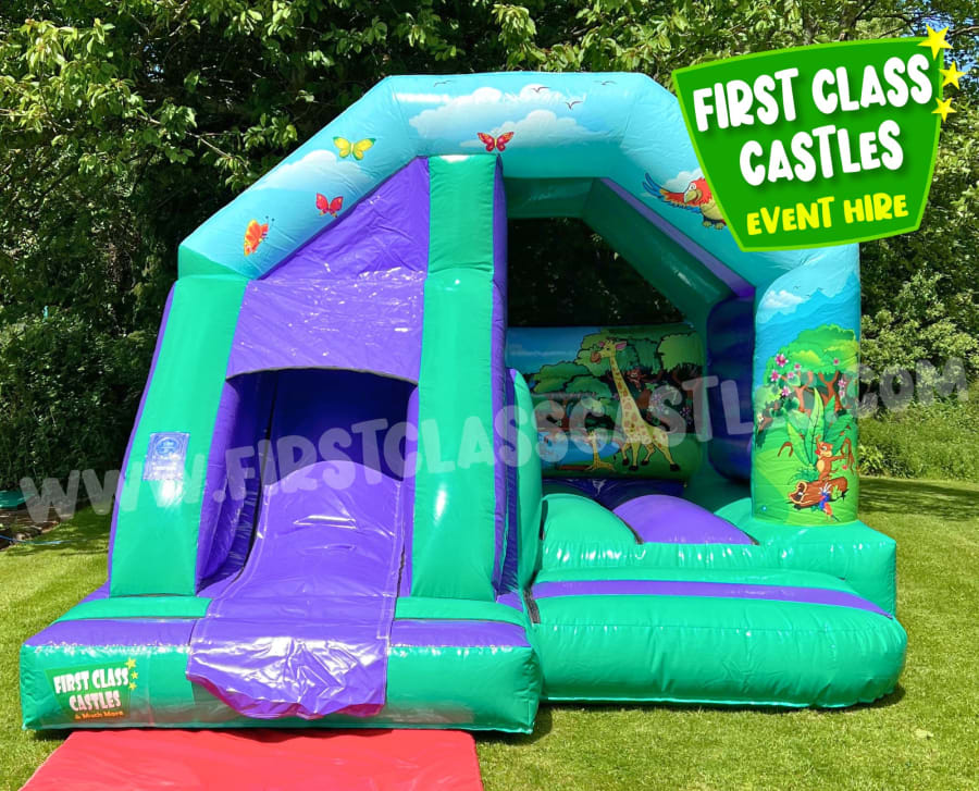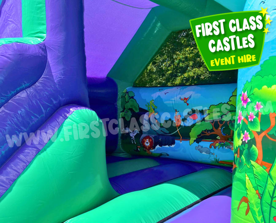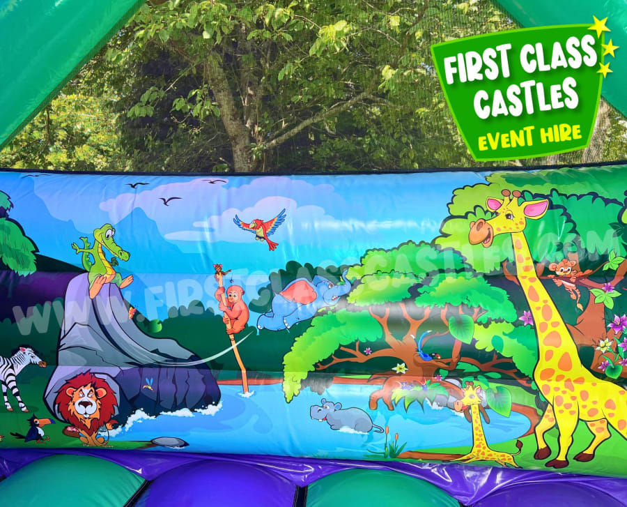 Bring the wild to your garden with our vibrant Jungle Playhouse – a fun and colourful inflatable designed for animal-loving adventurers! Measuring 15ft (L) x 12ft (W) x 10ft (H), this compact jungle-themed bouncy castle with front slide is perfect for narrow gardens, tight spaces, or indoor venue hire.