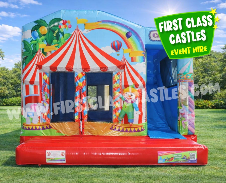 Choose First Class Castles for exceptional service and unforgettable entertainment. Make your child's party the talk of the town with the Circus Carnival 3in1 bouncy castle!