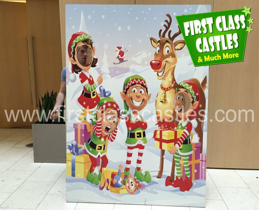 Description: Our incredible Christmas themed photo peep board. Your guests can peep their heads through this fantastic festive background for incredible photo opportunities. With four holes to peep through, the whole family can get involved.