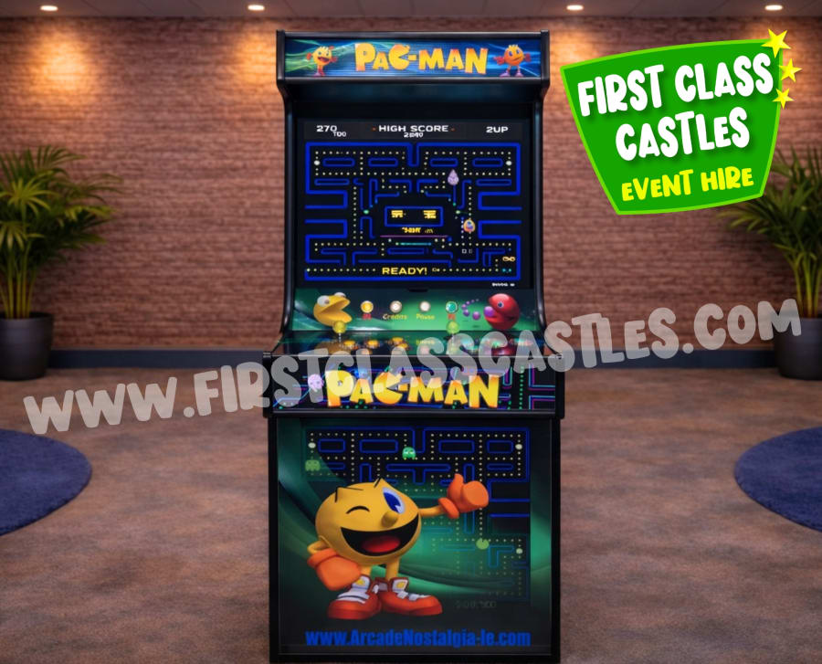 Description: First Class Castles are delighted to introduce our all new Retro Arcade Game Machine hire. Our game machines are preloaded with a Pandora Games System containing over 3,000 game options for your users to enjoy. The machines standing 5ft tall are visually striking with assorted retro game branding, looking fantastic at any event site. Our Retro Arcade Game machines are equipped with a 24" clear display screen, illuminated buttons and crisp sound. This game is fully branded with Sonic the Hedgehog graphics & led light box.