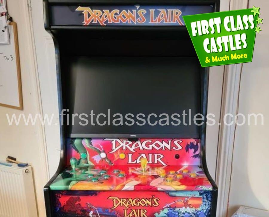 Description: First Class Castles are delighted to introduce our all new Retro Arcade Game Machine hire. Our game machines are preloaded with a Pandora Games System containing over 3,000 game options for your users to enjoy. The machines standing 5ft tall are visually striking with assorted retro game branding, looking fantastic at any event site. Our Retro Arcade Game machines are equipped with a 24" clear display screen, illuminated buttons and crisp sound. This game is fully branded with Dragon's Lair graphics & led light box.