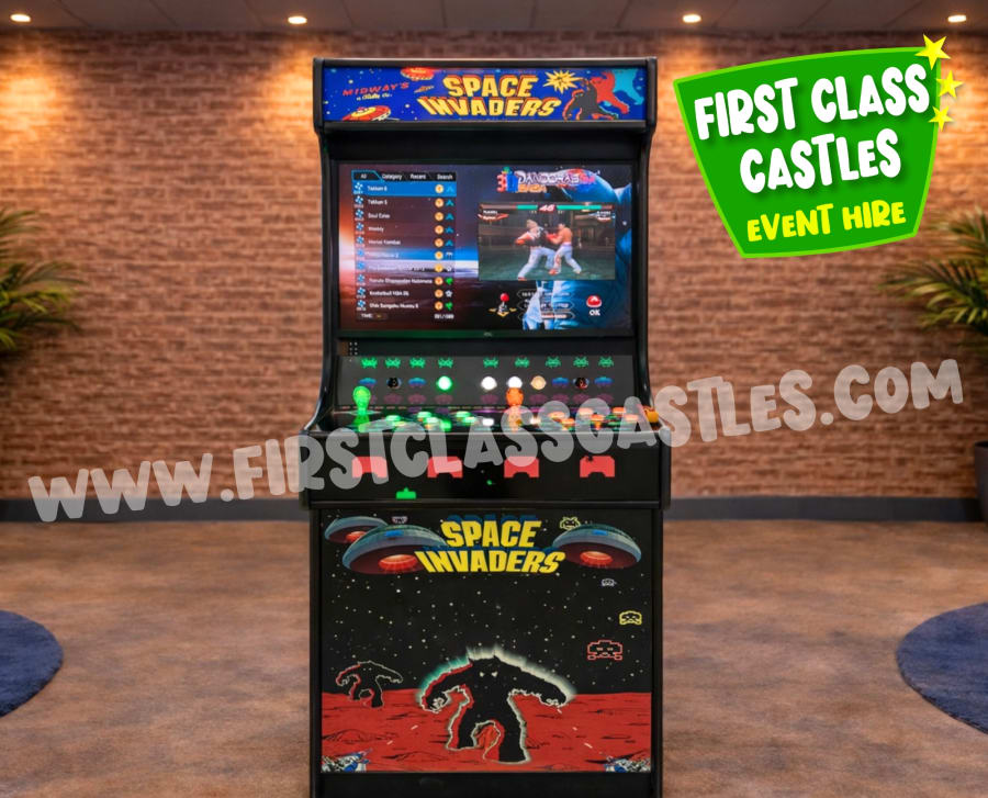 Description: First Class Castles are delighted to introduce our all new Retro Arcade Game Machine hire. Our game machines are preloaded with a Pandora Games System containing over 3,000 game options for your users to enjoy. The machines standing 5ft tall are visually striking with assorted retro game branding, looking fantastic at any event site. Our Retro Arcade Game machines are equipped with a 24" clear display screen, illuminated buttons and crisp sound. This game is fully branded with Space Invaders graphics & led light box.