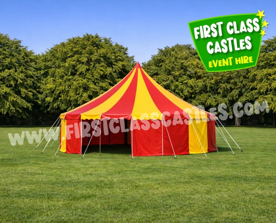 Add colour, energy and unmistakable carnival charm to your event with our 6m Circus Style “Little Top” Tent for Hire, available nationwide from First Class Castles. This striking mini big top circus tent is perfect for creating a vibrant focal point at corporate fun days, festivals, school events, brand activations and carnival themed parties.