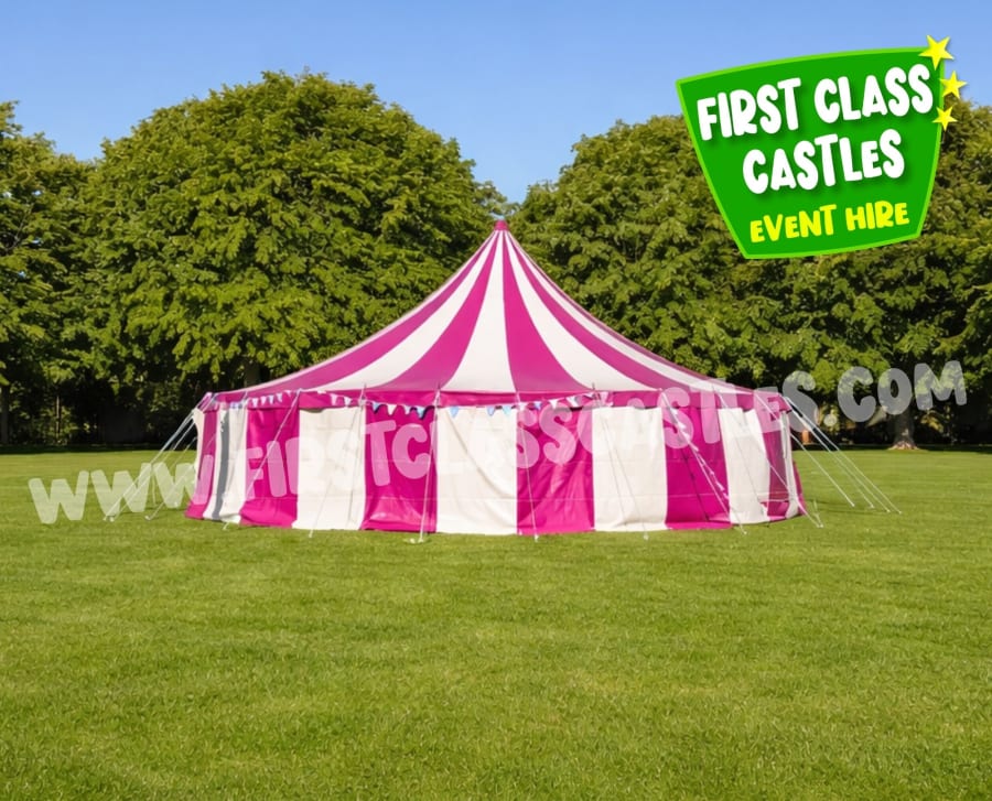 Create a stylish carnival atmosphere at your event with our 6m Raspberry & Cream Circus Style “Little Top” Tent for Hire, available nationwide from First Class Castles. This elegant mini big top circus tent combines the charm of a traditional carnival structure with a softer, more contemporary colour palette, making it perfect for festivals, corporate events, garden parties and premium themed celebrations.