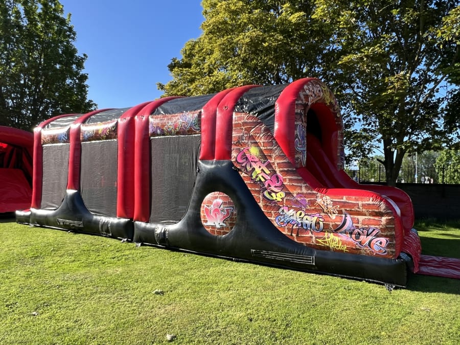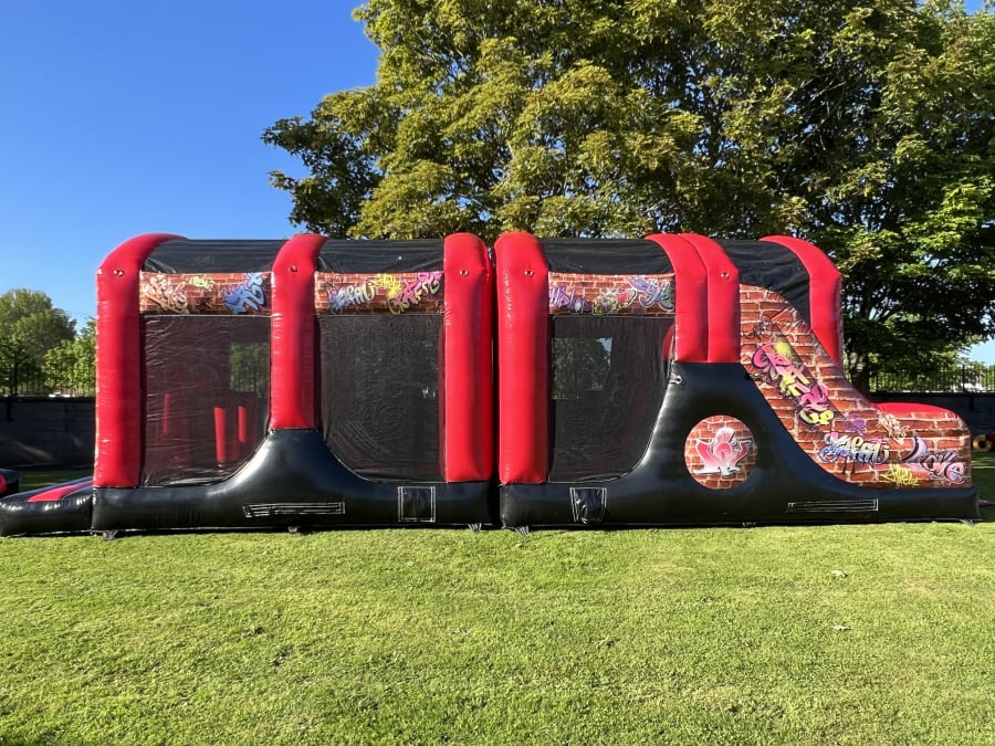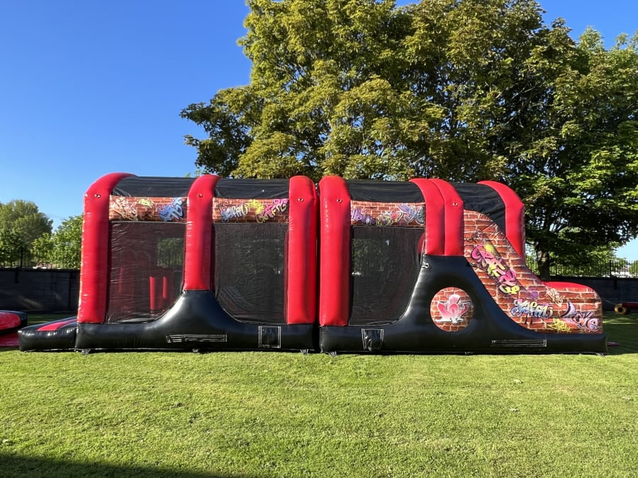 Measuring 40ft long, this inflatable obstacle course offers a fast-paced challenge where participants race through a sequence of obstacles before finishing with an adrenaline-fuelled slide. The vibrant graffiti artwork gives the unit a contemporary street-style look that appeals to both kids and teenagers, making it a versatile addition to any bouncy castle hire business in Ireland.