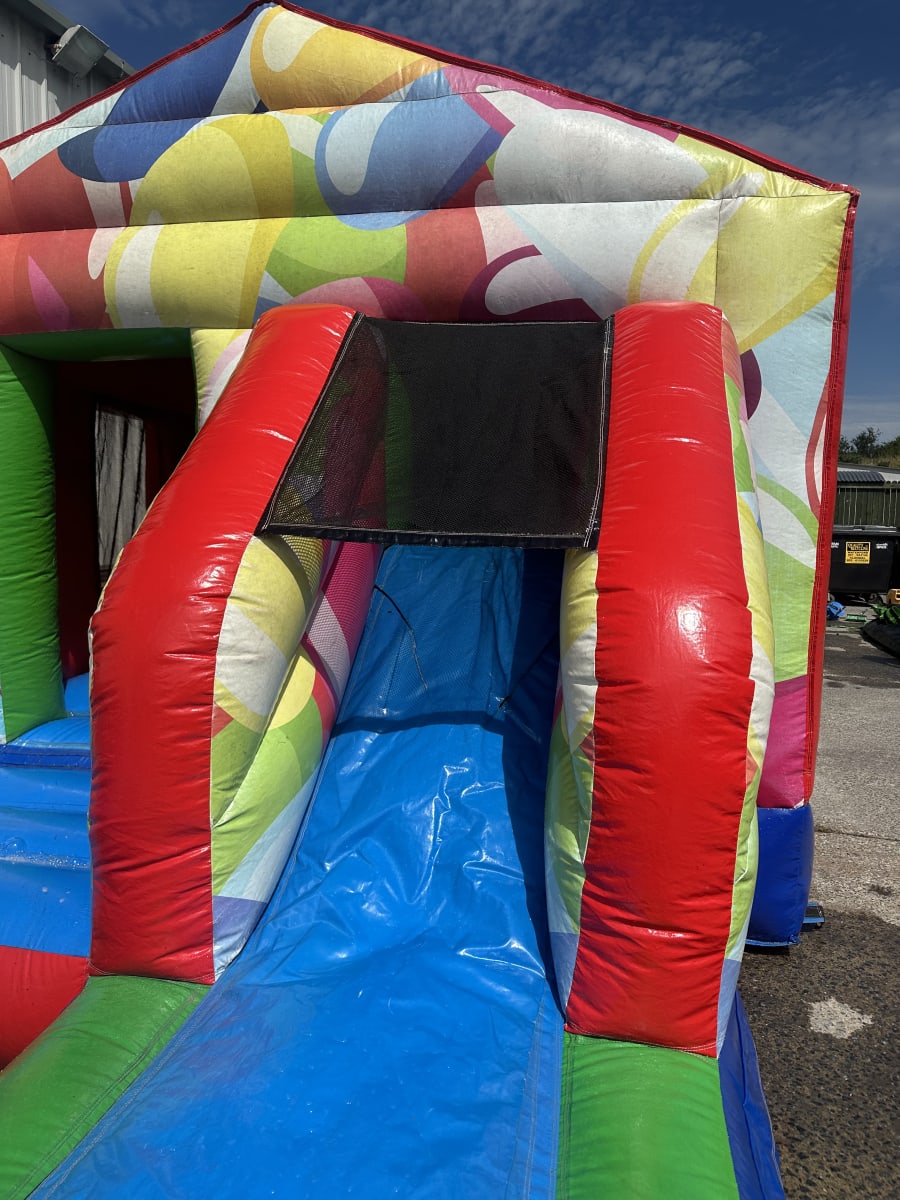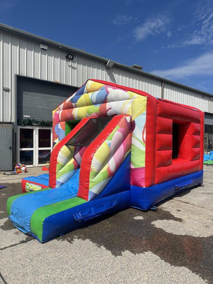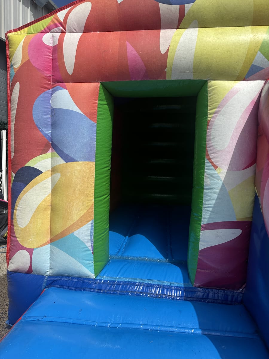 Designed with bright jelly sweet and candy-themed artwork, this inflatable creates a fun, playful atmosphere where children can bounce inside the fully enclosed castle before sliding out the front on the integrated slide. The colourful candy graphics make it a fantastic choice for younger children’s parties and a great visual addition to any event setup.