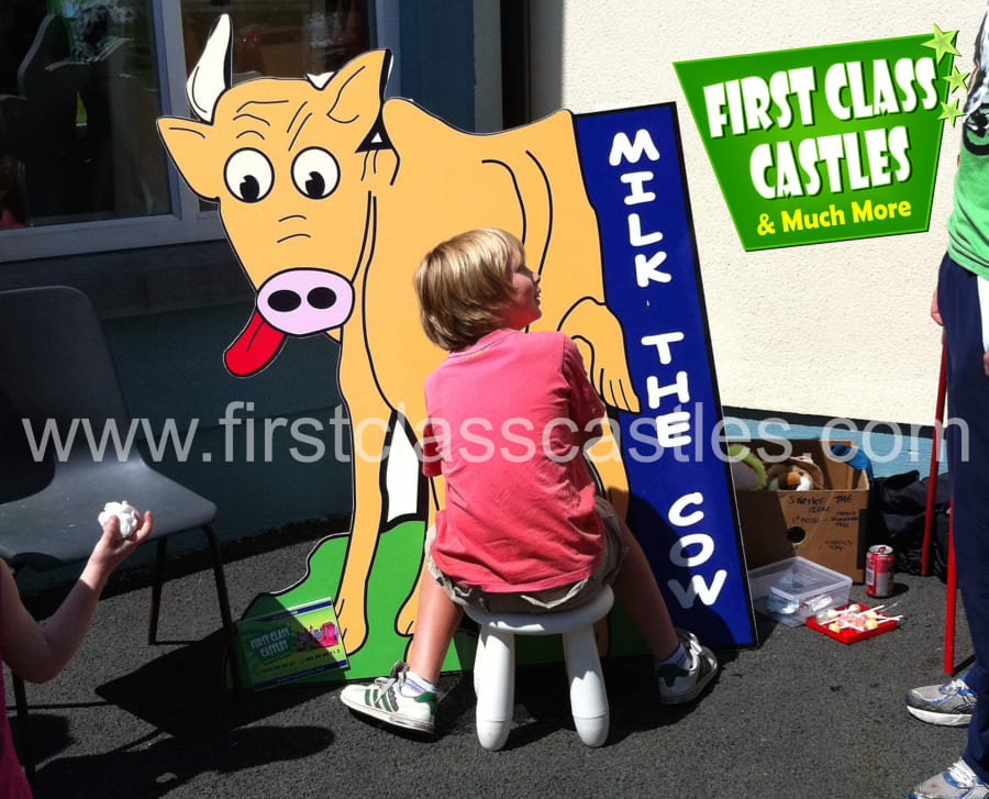 Description: The aim of the game is to have multiple contestants go head to head and see who can milk the largest quantity of milk from the the cow in a given timeframe, the milk is measured in a measuring jug (supplied) to see who has collected the most milk and is crowned the winner. This game is great fun for all the family. We recommend using water mixed with cornflower to give the appearance of milk without the mess.