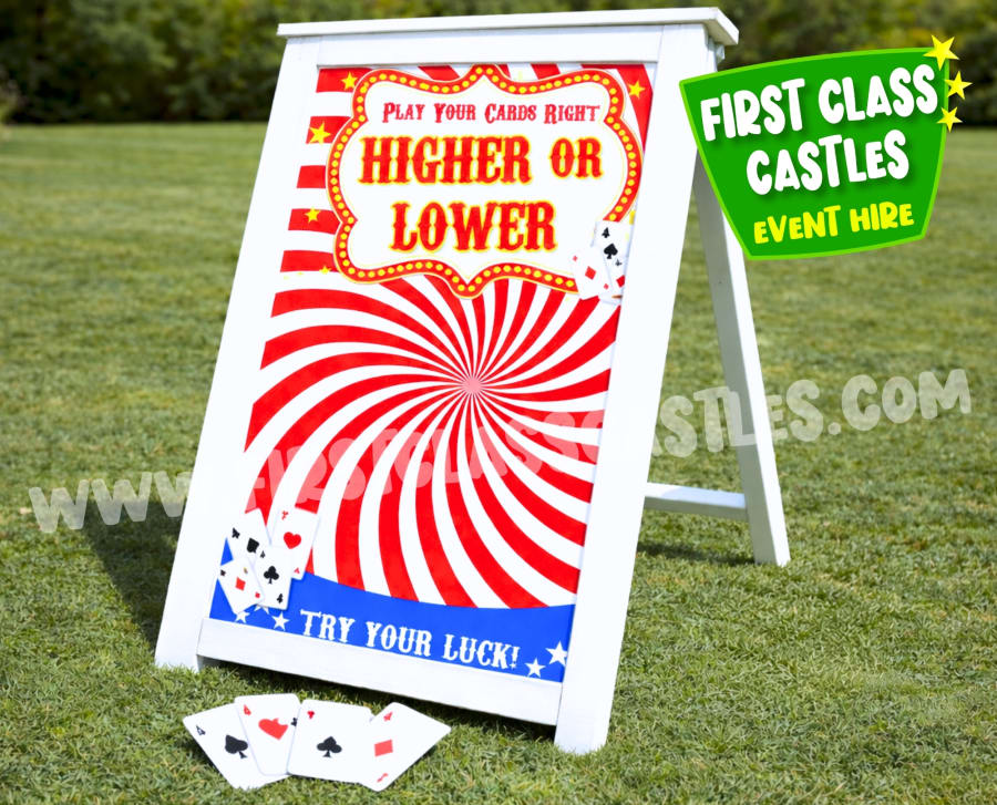 Description: The aim of the game is to guess the next card to appear on the board, just like Bruce's "Play Your Cards Right" TV game show. To succeed at this game, its just pure "LUCK", no real skill required. This game is a great addition to a Carnival theme event or any event.