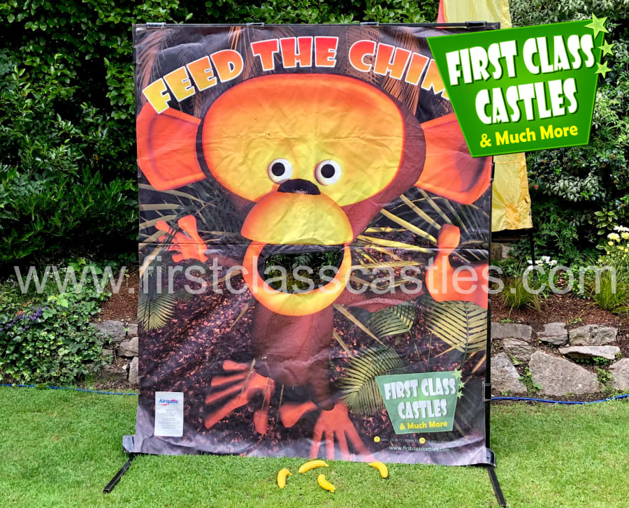 Description: The "Feed the Chimps Game" brings all of the energy and excitement of the zoo to any party or event. The aim of the game is to feed the monkey with plastic bananas (provided), by throwing them at the game board and getting the banana's in the monkey's mouth. This game supplied by First Class Castles is great fun for all the family. Game size 3350mm x 1800mm.
