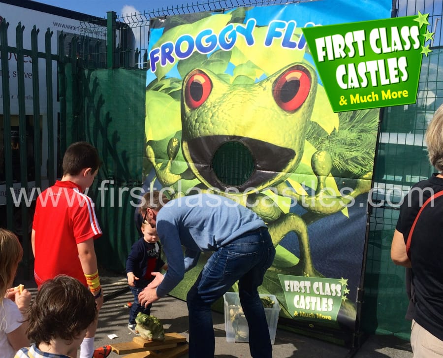 Description: Introducing First Class Castles "Frog Fling Game", the aim of the game is to feed the frog on the game board by flinging plastic insects (provided) into the frog's mouth by using the flicker board and mallet. This game is a great addition to any event.