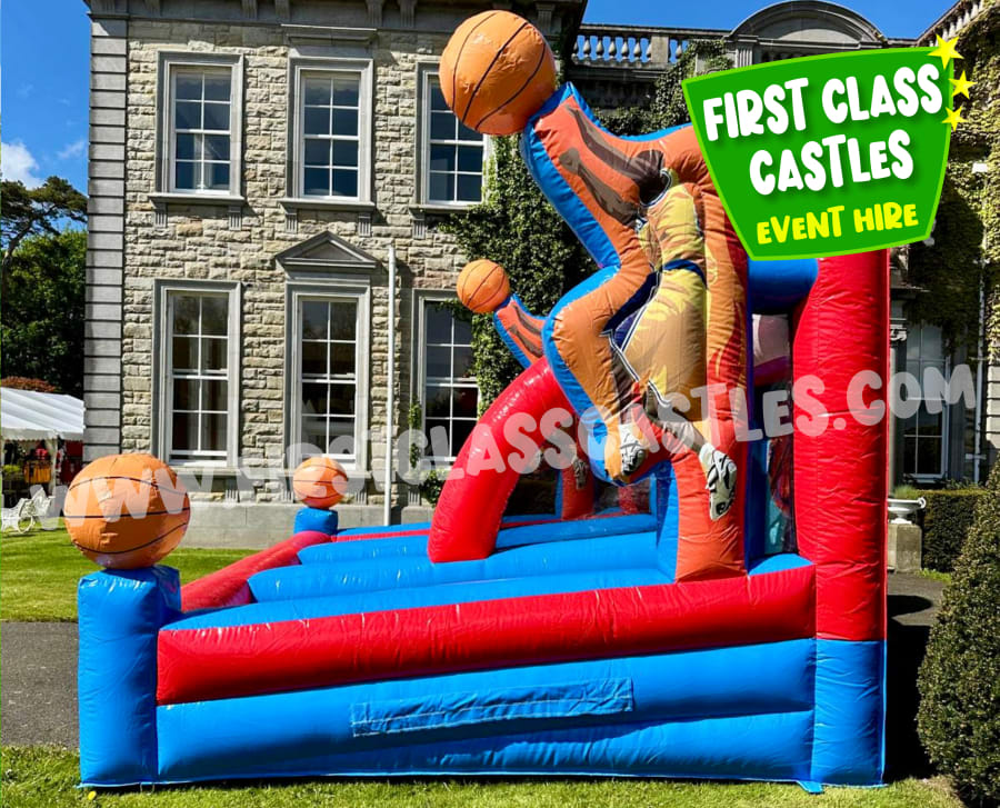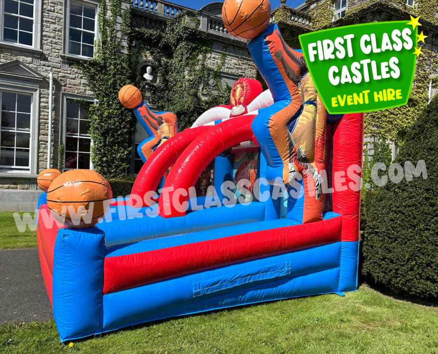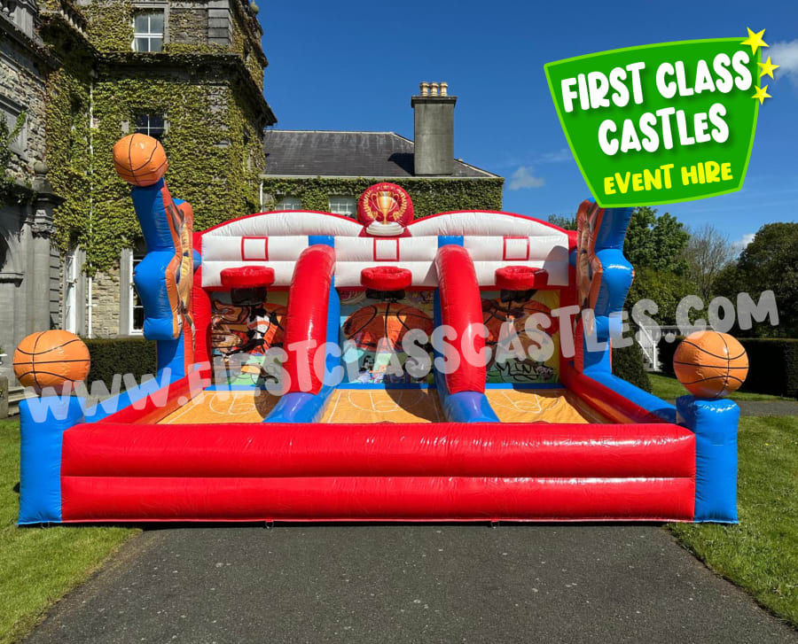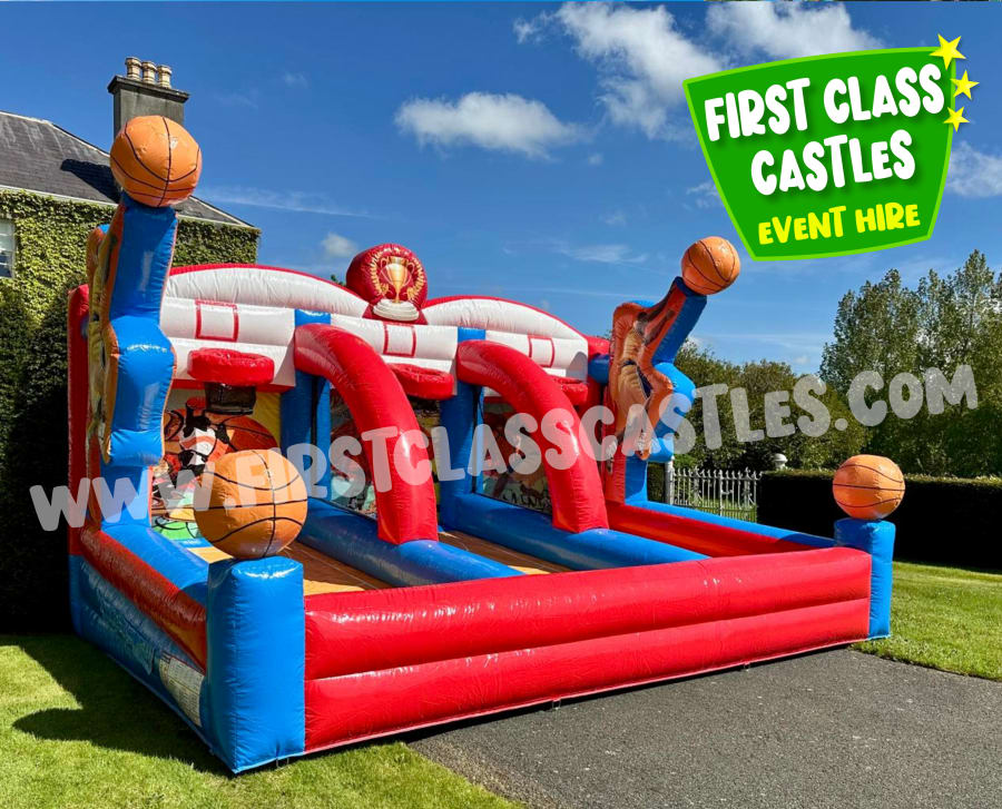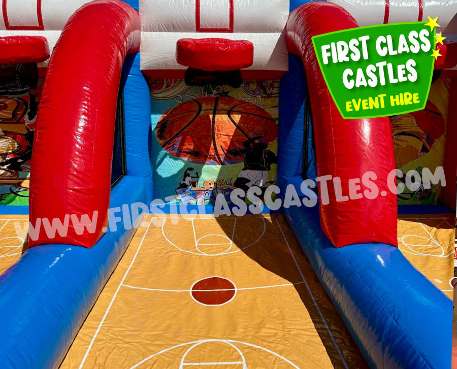 Description: 18ft(L) x 12ft(W) x 12ft(H) Basketball Hoops Game. Fancy something competitive? Hire our brand new Basketball Shoot. Boasting highly bright colours, our triple lane inflatable will give your guests a real buzz of fun. The inflatable, that comes supplied with basketballs has a sloped wall, so the balls just keep on rolling back at you.