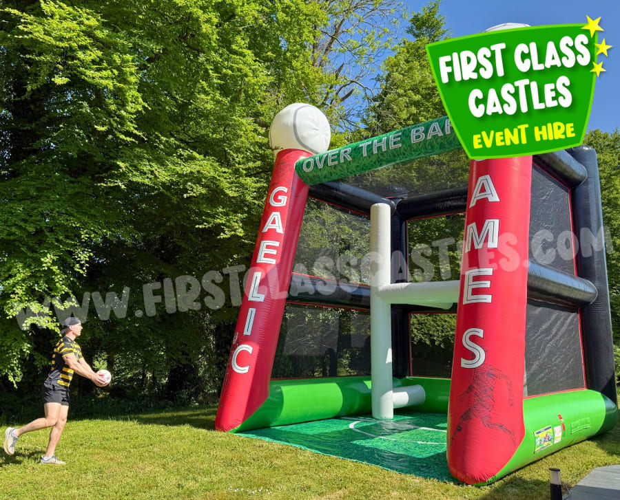 Looking for an unforgettable GAA Gaelic Games themed sports game or attraction in Ireland? The Over the Bar Football & Hurling Shootout is a larger-than-life inflatable football & hurling challenge that's guaranteed to bring crowds and excitement to any event. This is a dual purpose game, suitable for pucking a Sliotar or kicking a Gaelic Football. Whether you're planning a school fun day, sports fundraiser, festival, team-building day, or corporate activation, this inflatable football game is a crowd-pulling showstopper. This inflatable is a large striking attraction in any event space, exclusively designed by First Class Castles. Exclusively available from www.firstclasscastles.com.