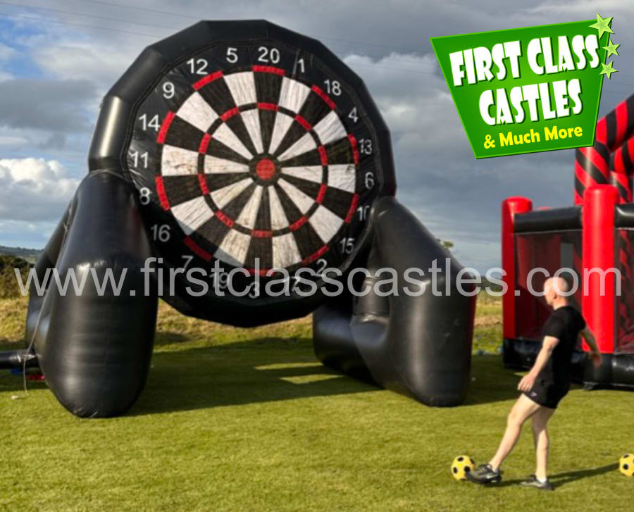 Description: Introducing our all new double sided GIANT Foot Darts and Target Shootout Game. With hire rates from as low as €250 per day, these giant games provide the perfect attraction for both private and public events. Whether it be a one-off promotional day in a shopping centre to stir up a crowd, unique event attraction, something different for a stag do or a longer term rental to bring people into your establishment, First Class Castles can provide you with a quick, easy and affordable solution that we guarantee everyone will be talking about. As this game is double sided it offers two completely different games in one impressive unit. The first side has a traditional side dartboard format and the second side is a target shootout design, both made using extremely sticky velcro! The aim of the game us to kick the footballs and they stick to the huge velcro targets to mark your position. Great fun for both participants and spectators alike.
