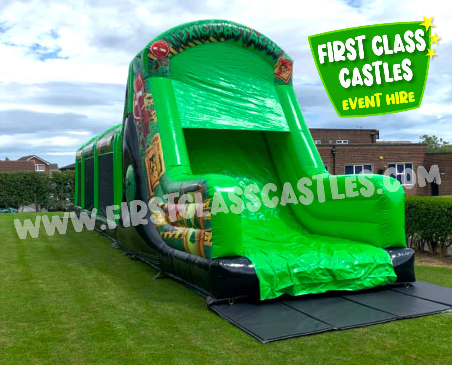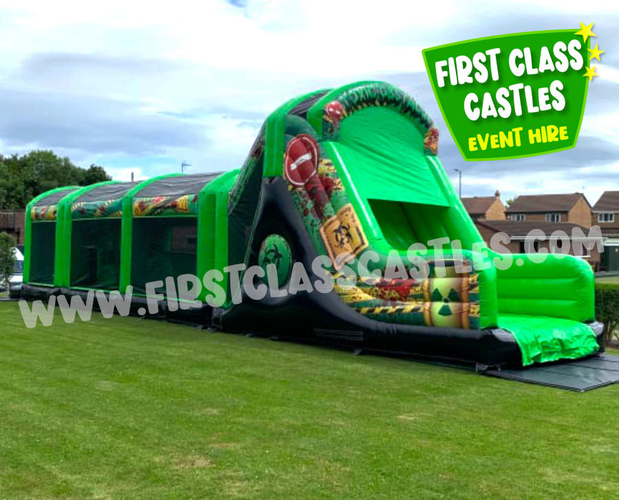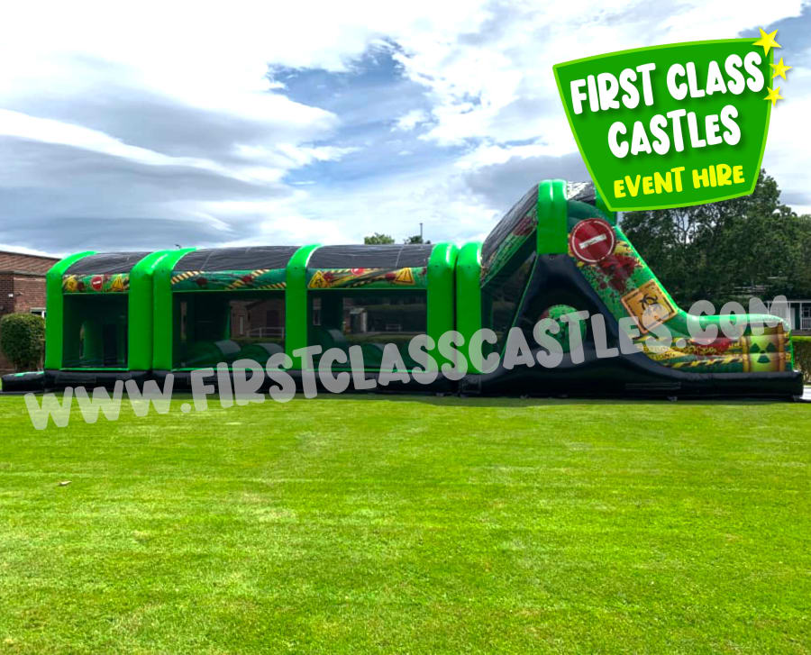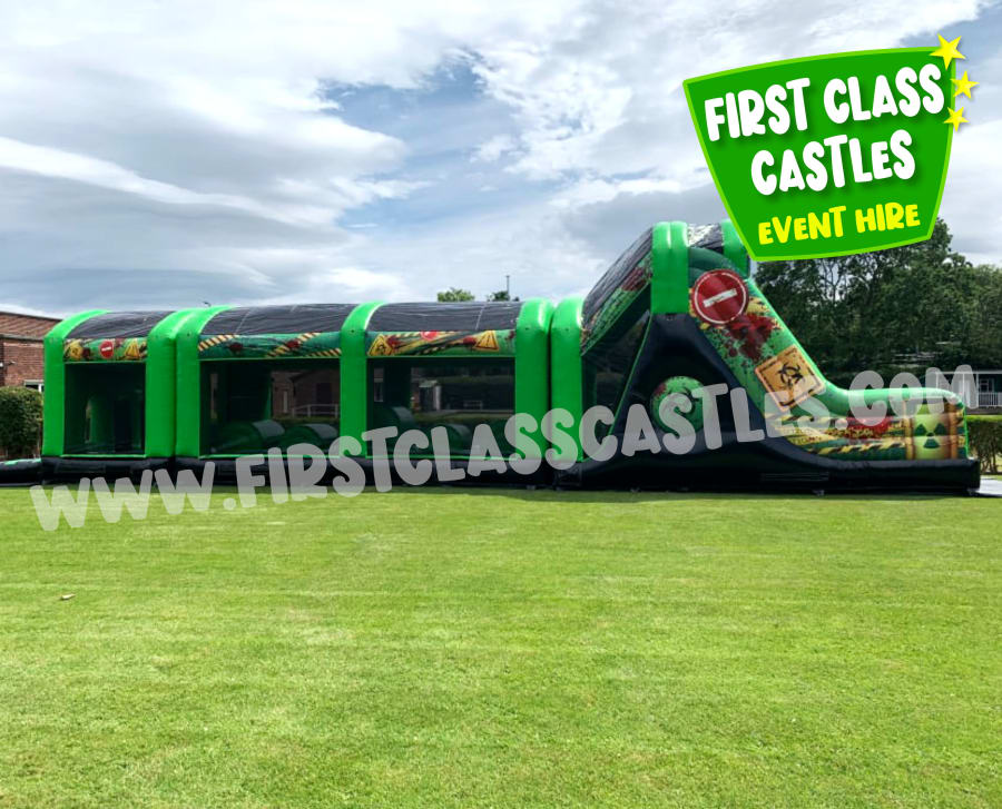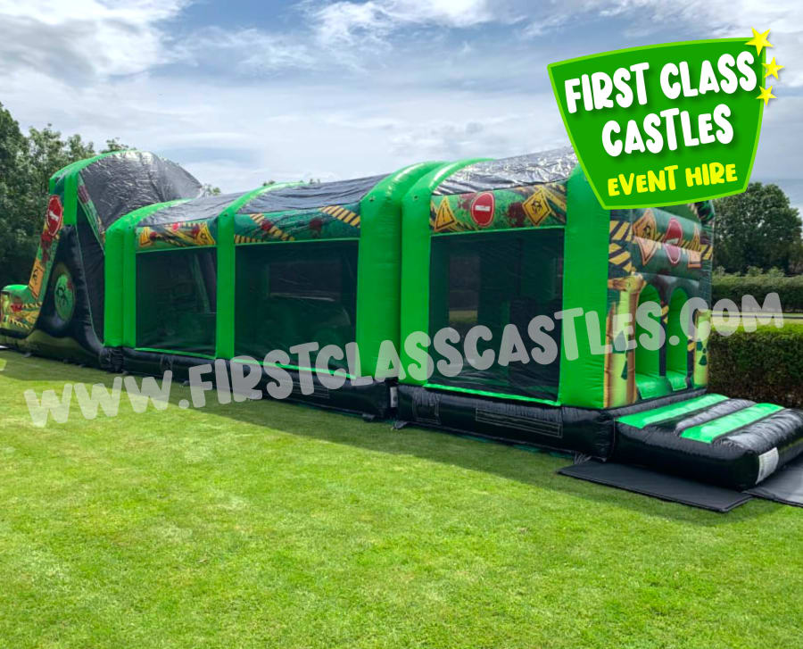 Description: Measuring 65ft(L) x 11ft(W) x 15ft(H) "Radioactive Rush" is a huge twin lane Army themed Obstacle Course with mega integrated 10ft platform drop slide. This Obstacle Course for hire has a mega slide for a regular footprint! Suitable for any age group, both Adults & Kids events alike (just not at the same time of course!) Consists of climbing, crawling and sliding areas. Really impressive and large scale unit for any event. . The cool green army combat theme looks impressive on any landscape or event site with fully camouflage printed roof. This product is also available in a Toxic Nuclear Theme theme, please view our other products. This item is exclusively designed and built for First Class Castles. Click on the 'more info' button to view additional images. This assault course inflatable is fantastic as part of a team building activity, it's a Knockout or Military Assault Challenge Course. Contact our team for further information on Family Fun Day events and Corporate Entertainment + Team Building Activities.
