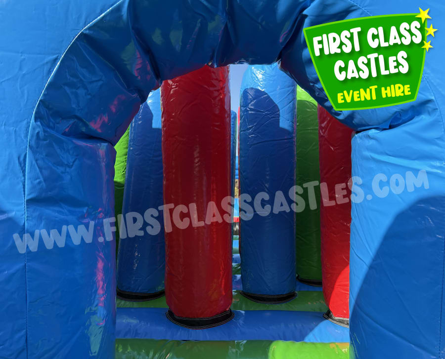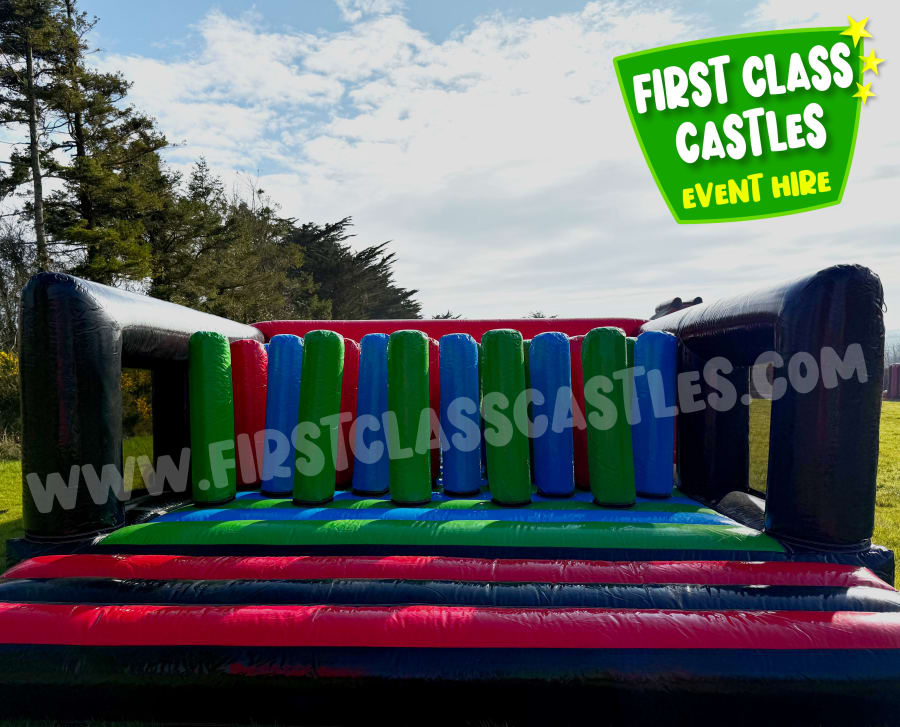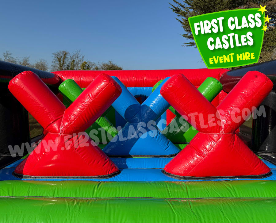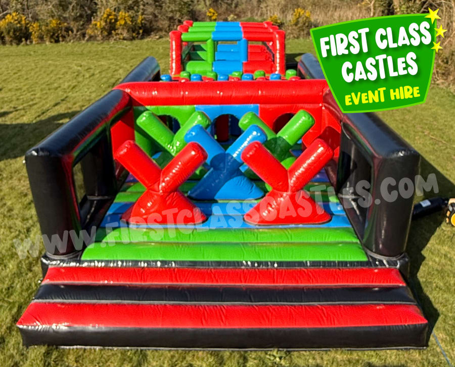 This incredible Obstacle Course Challenge compliments all our 'ULTIMATE WIPEOUT LIVE' Games. The full circuit is designed exclusively for us in a triple lane format with colour coded GREEN, BLUE & RED lanes. The idea behind this Obstacle Course design is that the sections are stand-aline individual pieces. These sections can then be set about as individual stations whereby participants run from one section / activity station to the next, perhaps with some smaller challenger in between! The options are endless! Having all pieces set across an event site or pitch really adds that 'WOW' factor to any event site. Make this incredible 5 Section Obstacle Course really 'POP' with our matching auxiliary games including; Vertical Climbing Wall, Warrior Wall, Gladiator Duel, Cliff Jump, Bungee Run, Interactive Shootout & many more...