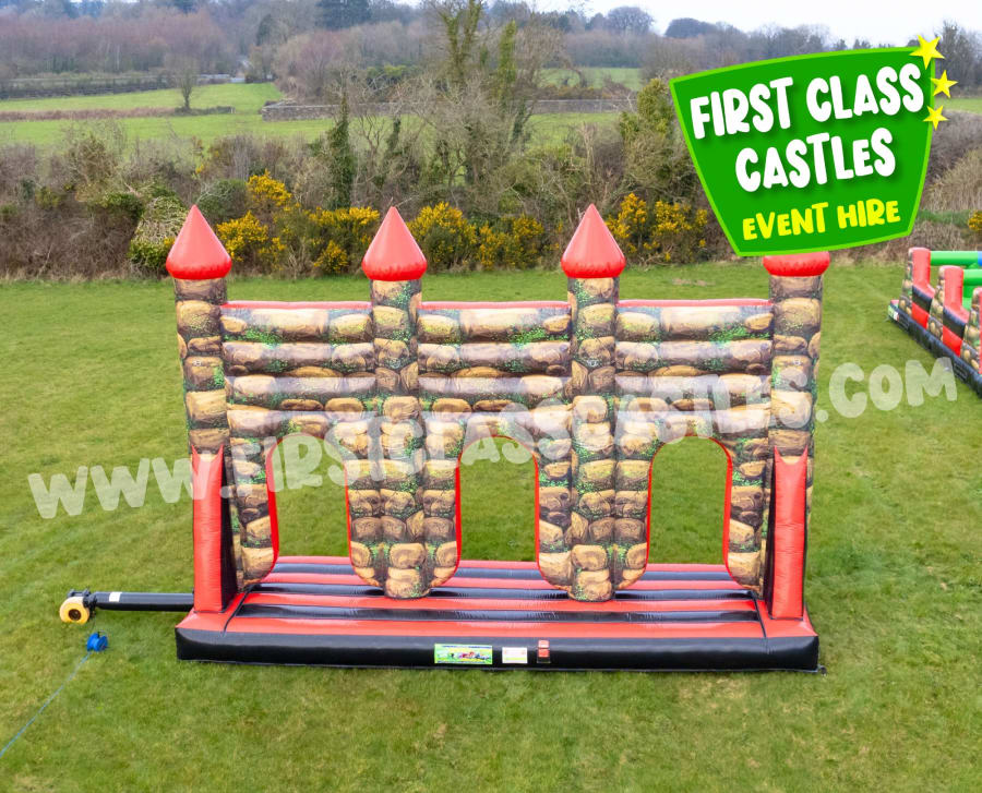 You’ll face off against a massive triple-arch inflatable castle wall, standing proud and ready to test your team’s agility, coordination, and sponge-hurling skills. Here’s how it works: