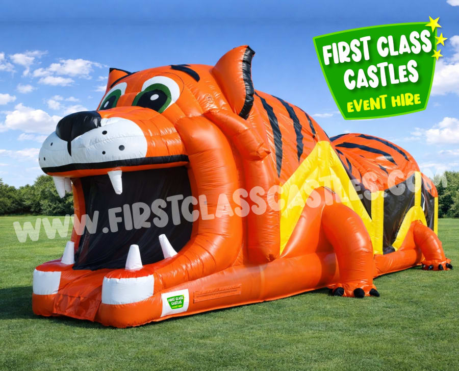 This isn’t just an obstacle course – it’s a centre-piece attraction. The bold 3D tiger design makes it one of the most eye-catching units in the First Class Castles range, while the long run-through layout keeps queues moving and participants coming back for “just one more race.”