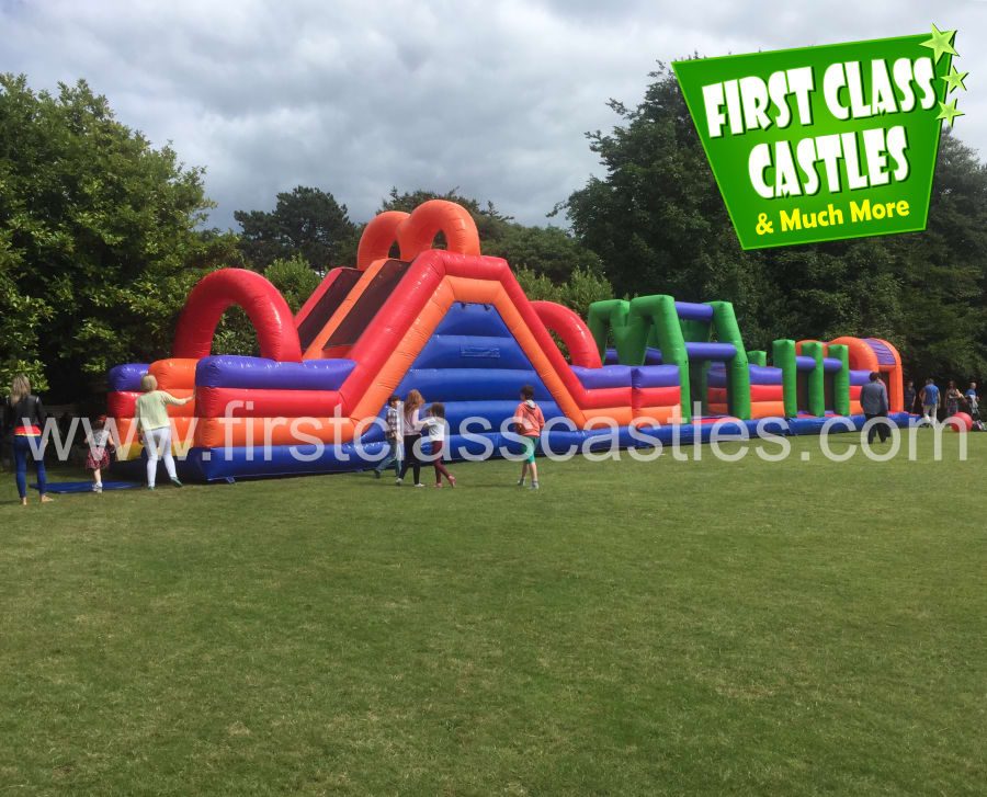 Description: 100ft(L) x 15ft(W) Twin Lane Obstacle Course with mega slide. Suitable for any age group. Consists of climbing, crawling and sliding areas. Really impressive and large scale unit. This unit is ideally suited to large events with a high attendance. Make sure you have plenty of space for this one......... It's HUGE! ! ! Thanks to it's durable build and its large size, this bouncy assault course can be used by both children and adults. It's great fun for all ages, and provides endless entertainment!We can create a whole total wipeout challenge around this product.