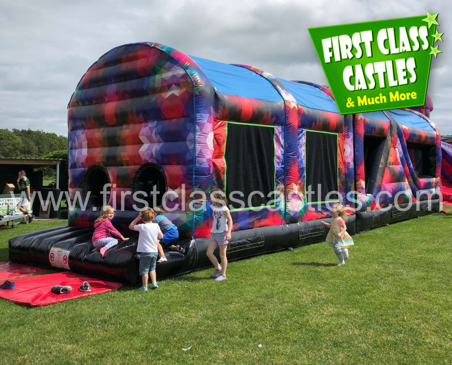 Description: The new model "Kaleidoscope" is a 45ft(L) x 15ft(W) x 15ft(H) Obstacle Course. The unit is fitted with safety netting on each side allowing ease of visibility and supervision for parents. The whole unit is printed with a multi coloured Kaleidoscope effect artwork. The majority of this Obstacle Course is enclosed making it suitable for use even in showery weather. The course consists of a port-hole entrance, jump through area, tunnells, pop-up tubes and the all important slide to finish. This is a nice neutral multi-coloured design making it suitable for most age groups. Visually stunning... adults and kids alike will be impressed with this fun inflatable. This is a really popular product and availability is limited, call us today to secure your date.
