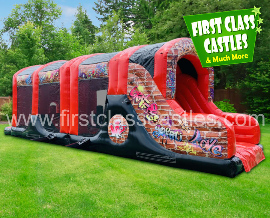 Description: 42ft (L) X 11ft(W) X 13ft (H) Urban Black & Red Graffiti Themed Inflatable Obstacle / Assault Course Bouncy Castle for Hire. First Class Castles are pleased to present this all new inflatable obstacle course for hire measure in at whopping 42ft in length yet is still perfect for both indoor and outdoor hire. 42ft is a brilliant length making it suitable for most domestic parties, pubs, clubs, schools, fun-days, scouts, cubs, guides and other community groups aiming to keep children entertained for longer periods of time than the standard bouncy castle for example.