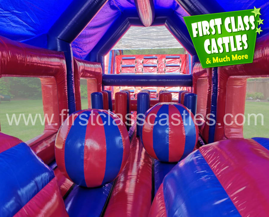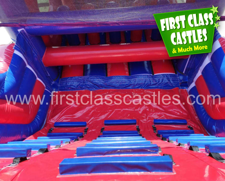 Description: Measuring 65ft(L) x 15ft(W) x 17ft(H) "Olympic Quest" is a huge twin lane Obstacle Course with integrated 10ft platform drop slide. This Obstacle Course for hire is MEGA! Suitable for any age group, both Adults & Kids events alike (just not at the same time of course!) Consists of climbing, crawling and sliding areas. Really impressive and large scale unit for any event. This is a monster. This product is also available in an Army / Military theme called "Military Mission". This item is exclusively designed and built for First Class Castles. Click on the 'more info' button to view additional images. This assault course inflatable is fantastic as part of a team building activity, it's a Knockout or Olympic Challenge Course. Contact our team for further information on Family Fun Day events and Corporate Entertainment + Team Building Activities.