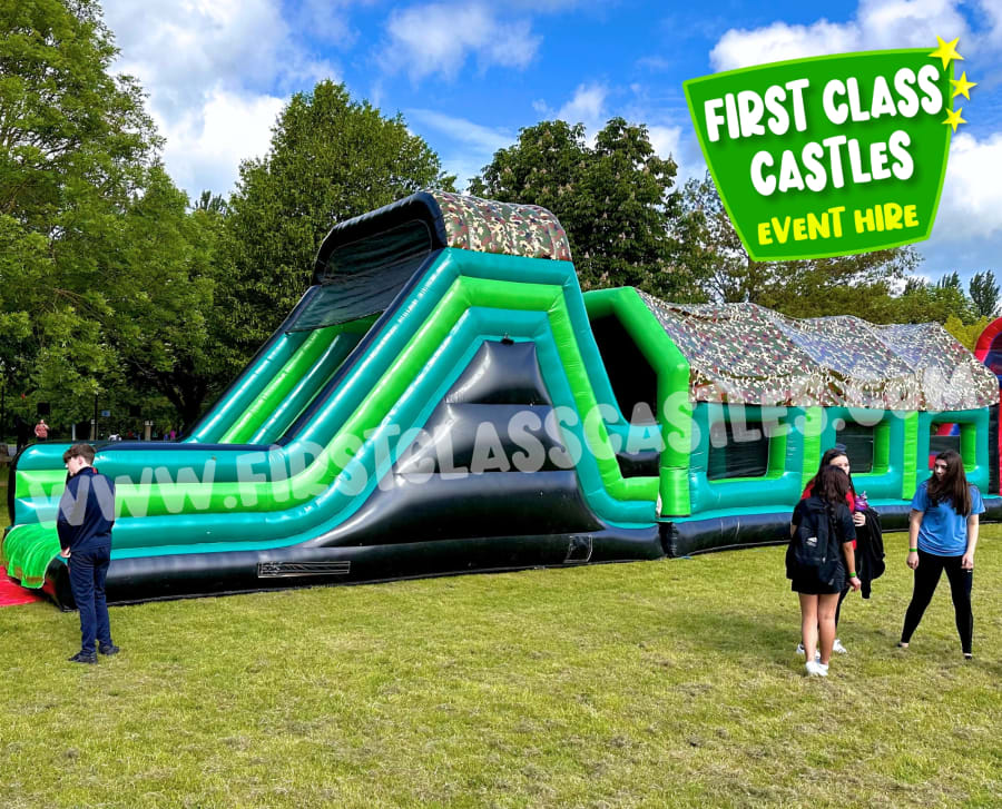 Take on the ultimate inflatable combat challenge with Military Mission – a 65ft twin-lane Army themed obstacle course for hire in Ireland featuring a giant 10ft platform drop slide and striking full camouflage printed roof.