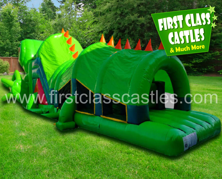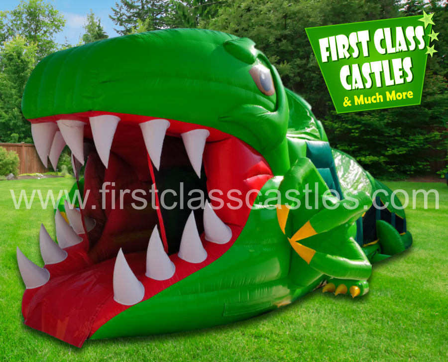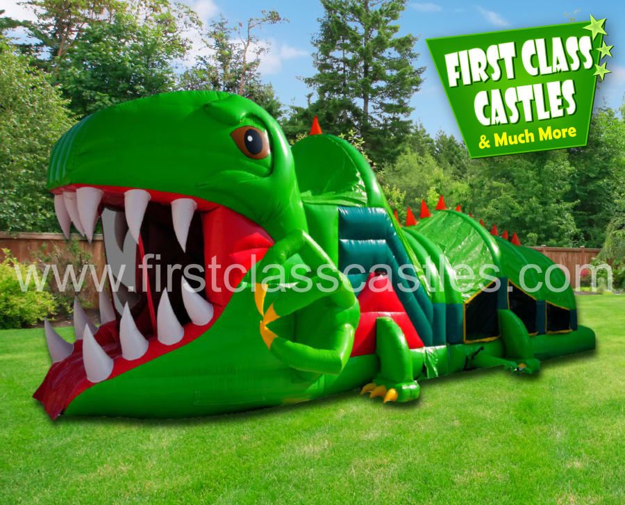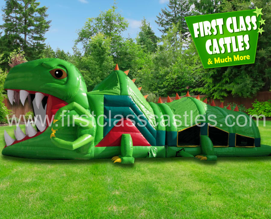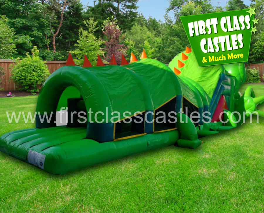 Description: Introducing the all new "Dino Rex" Obstacle Course, 40ft(L) x 15ft(W) x 12ft(H) large 3D digitally printed scaly Crocodile themed Obstacle Course. Imagine the look on your kids faces as this huge two section Crocodile is inflated at your venue. Suitable for any age group. Consists of climbing, crawling and sliding areas. Really impressive and large scale unit for any event, you will be gobsmacked by the sheer scale of it. This item is perfect kids activity to compliment any Jungle, Reptile, Jurassic or Zoo Themed event.