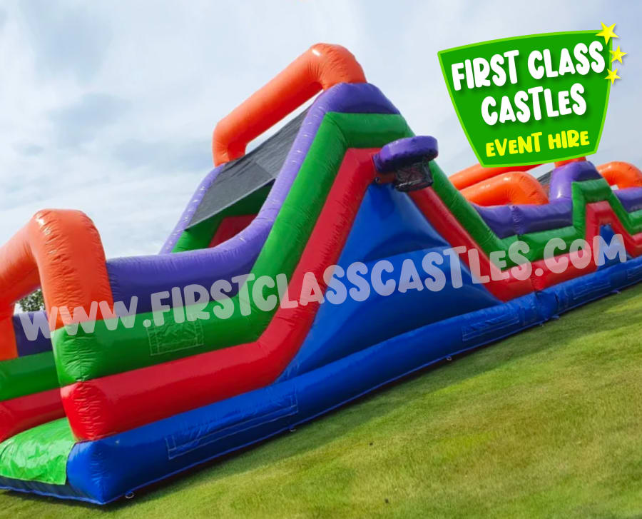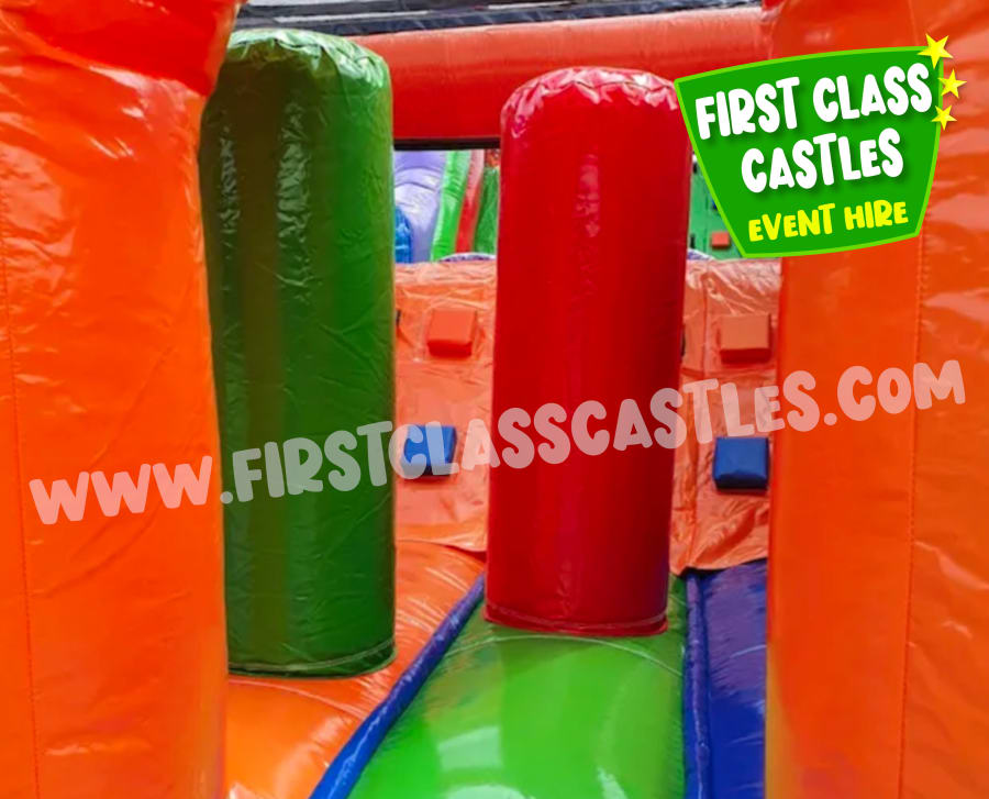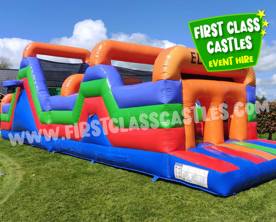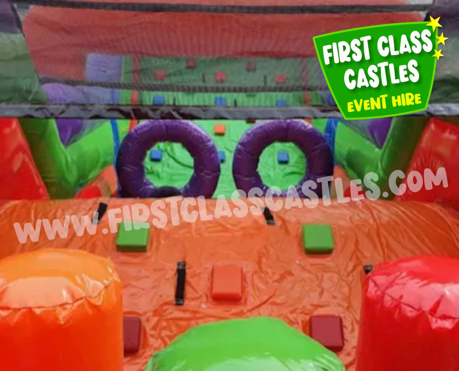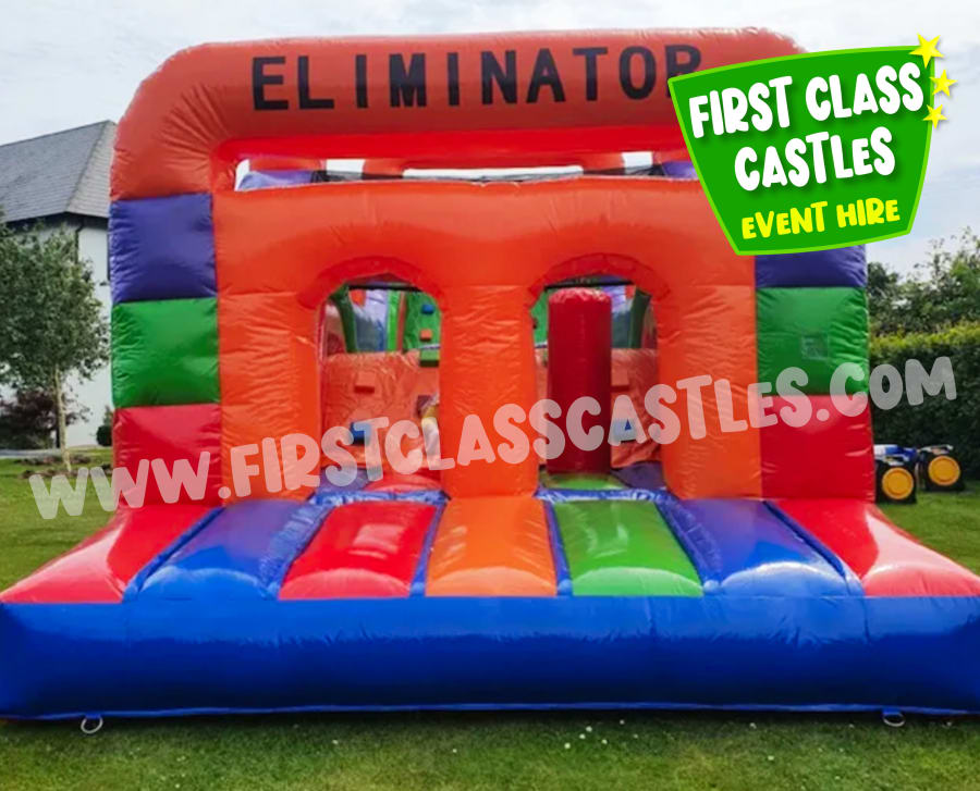 Description: Introducing our hugely popular Eliminator Obstacle Course! We've taken an old favourite and revamped it for this season and improved safety features also. The Eliminator has been our most popular hire product annually for the past five years. This is a large multi-coloured Obstacle Course, great fun and very popular unit that can cater for a large number of people of most age groups. The units consistsof a series of obstacles including climbing, crawling and the all important slide to finish. The slide is an impressive 8ft high with a rock-wall climb, with basketball hoops fitted on each side. This Eliminator 2 version is Black, Red & Orange in colour, the perfect accompaniment to our Black & Red Competitive Games Package or simply just to rent on it's own!