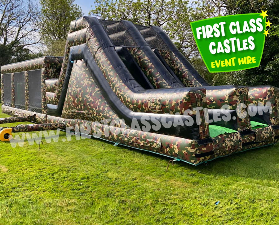 Description: 50ft(L) x 15ft(W) x 12ft(H) Dual Lane Army themed Obstacle Course or Assault Course. Are you ready to take on this bootcamp style challenge? Get ready for Battle in the super cool inflatable game! The "Army Avenger" is a fully camouflage printed obstacle course with a series of fun challenges. Suitable for any anyone over 5years. Consists of climbing, crawling, squeeze through and sliding areas. Really impressive and favoured by kids of all ages. This is anticipated to be our most popular Obstacle Course this year. This unit has an impressive dual lane inflatable slide at the end with an exhilarating 8ft high platform.