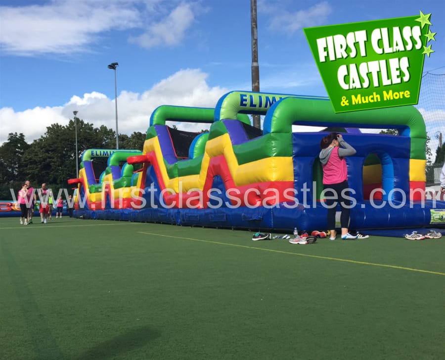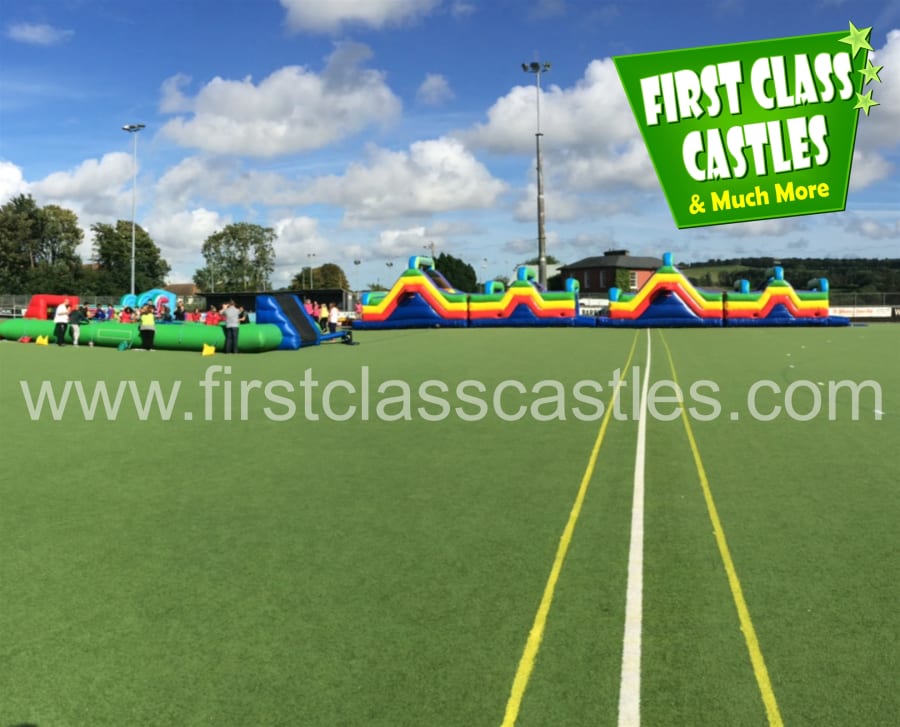 Description: 100ft(L) x 12ft(W) Twin Lane Obstacle Course (Or 2 X 50ft Obstacle Courses as per Image). Suitable for any age group. Consists of climbing, crawling and sliding areas. Really impressive and large scale unit. This unit is ideally suited to large events with a high attendance. Make sure you have plenty of space for this one......... It's HUGE! ! ! Can be broken down into sections of 40ft, 60ft or 80ft also, to suit smaller events. Can also be provided at larger sizes of 120ft and 140ft.