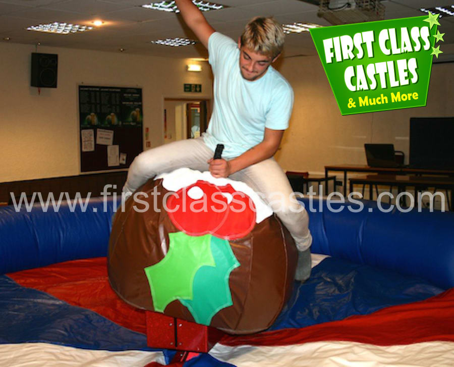 We've all ate Christmas Pudding but now it is possible to sit on one! The rodeo Christmas Pudding is a must have addition to any Christmas event, promotion or party. The rodeo replicates the motions of a real-life bucking Christmas Pudding, if there is such a thing! The rider must hold on for as long as possible before being bucked off the pudding. Don't worry, there is an inflatable base surrounding the rodeo for the riders safety and soft landing! The Christmas Pudding spins and bucks at the control of our trained operator. The pudding can be slowed down and sped up to enable all users to enjoy the ride. The duration of the ride is automatically timed and shown on the large display panel for all spectators and riders to see. This ride is also fitted with an automatic stop switch for the rider’s safety